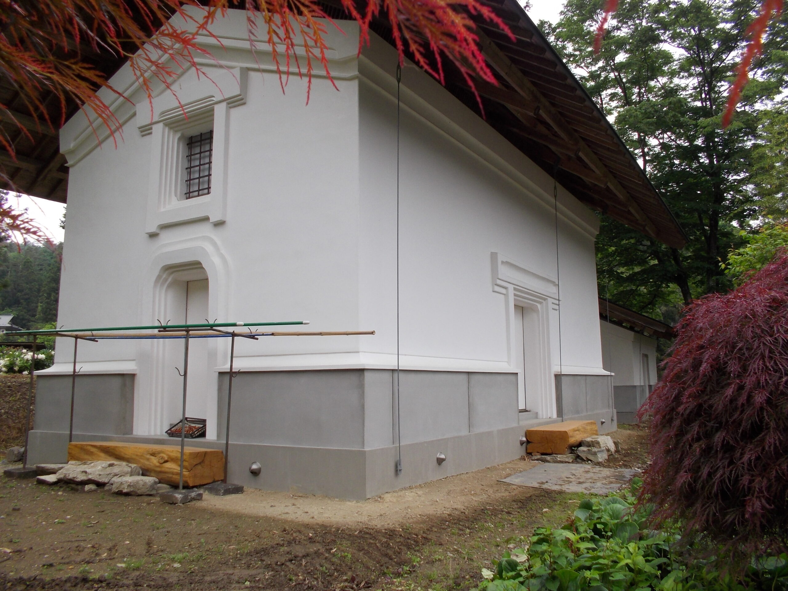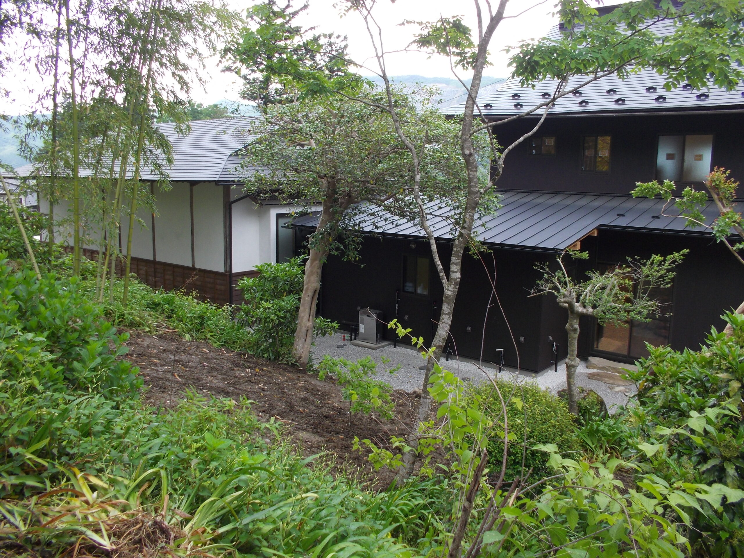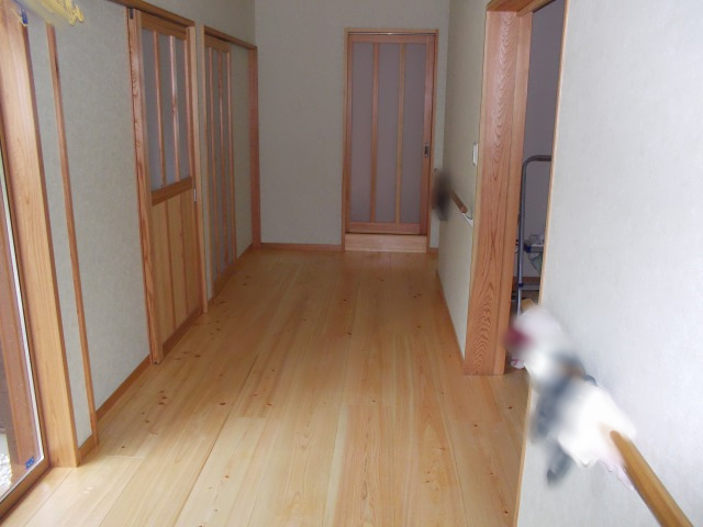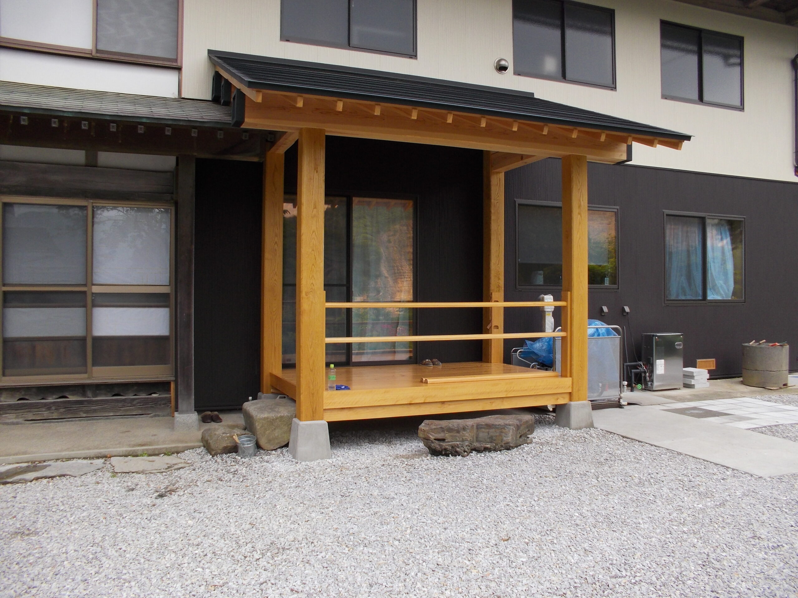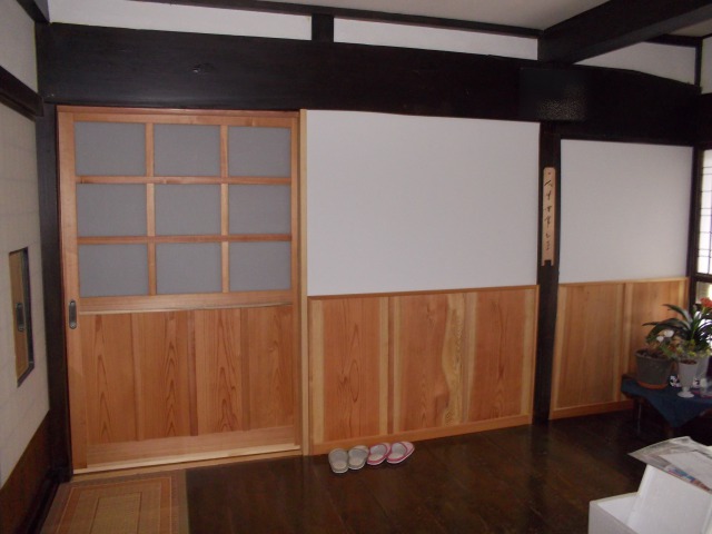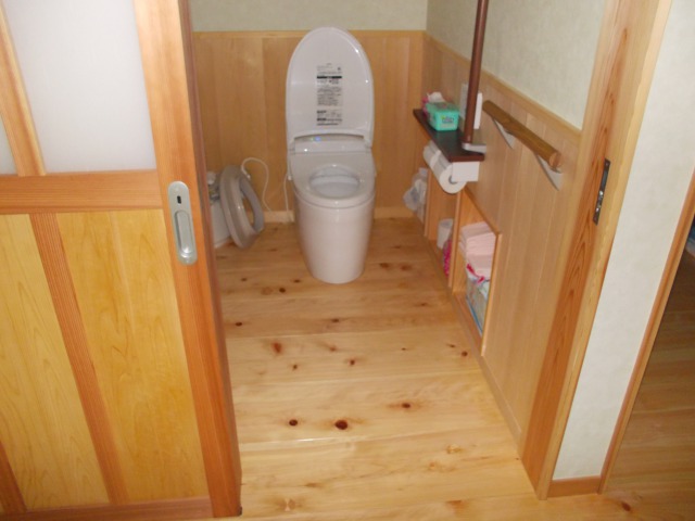 骨組みをそのままに、木を生かした造作、建具を作りました。開口が大きいので、車いすも出入りできます。 出入口を造作扉にして開口を大きくし、使い勝手のいいトイレを施工しました。 出入口の引き戸はほほ吊り戸にしており、床の段差を無くし、広く使い勝手のいい空間にしております。広縁ですが、大の字で寝そべっても気持ちがいい空間です。 裏の池に通ずる裏庭も植栽を減らし、細かい砂利を敷くことで見晴らしのいい空間を施工しました。