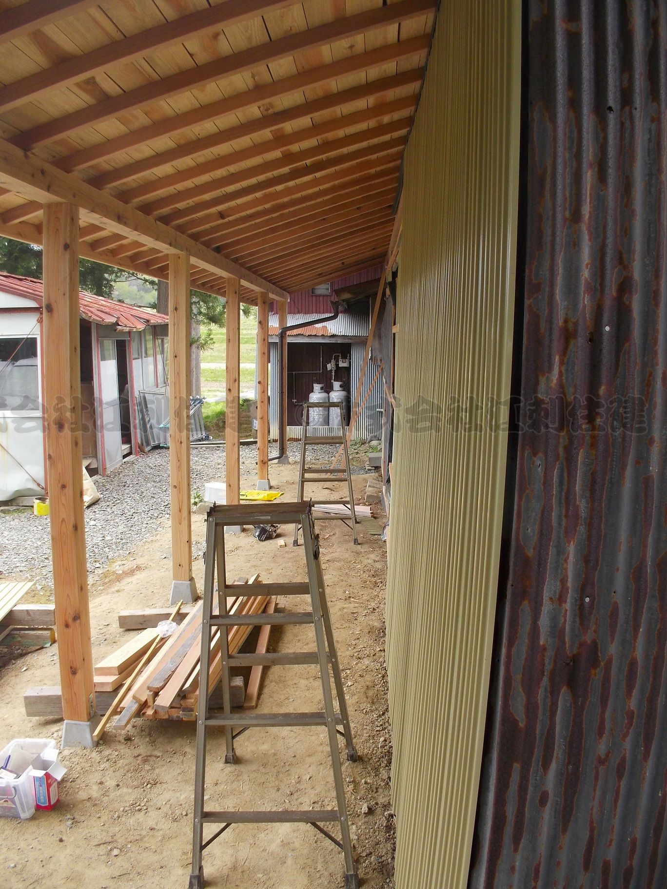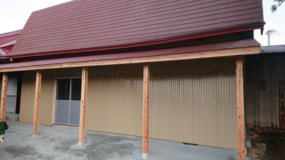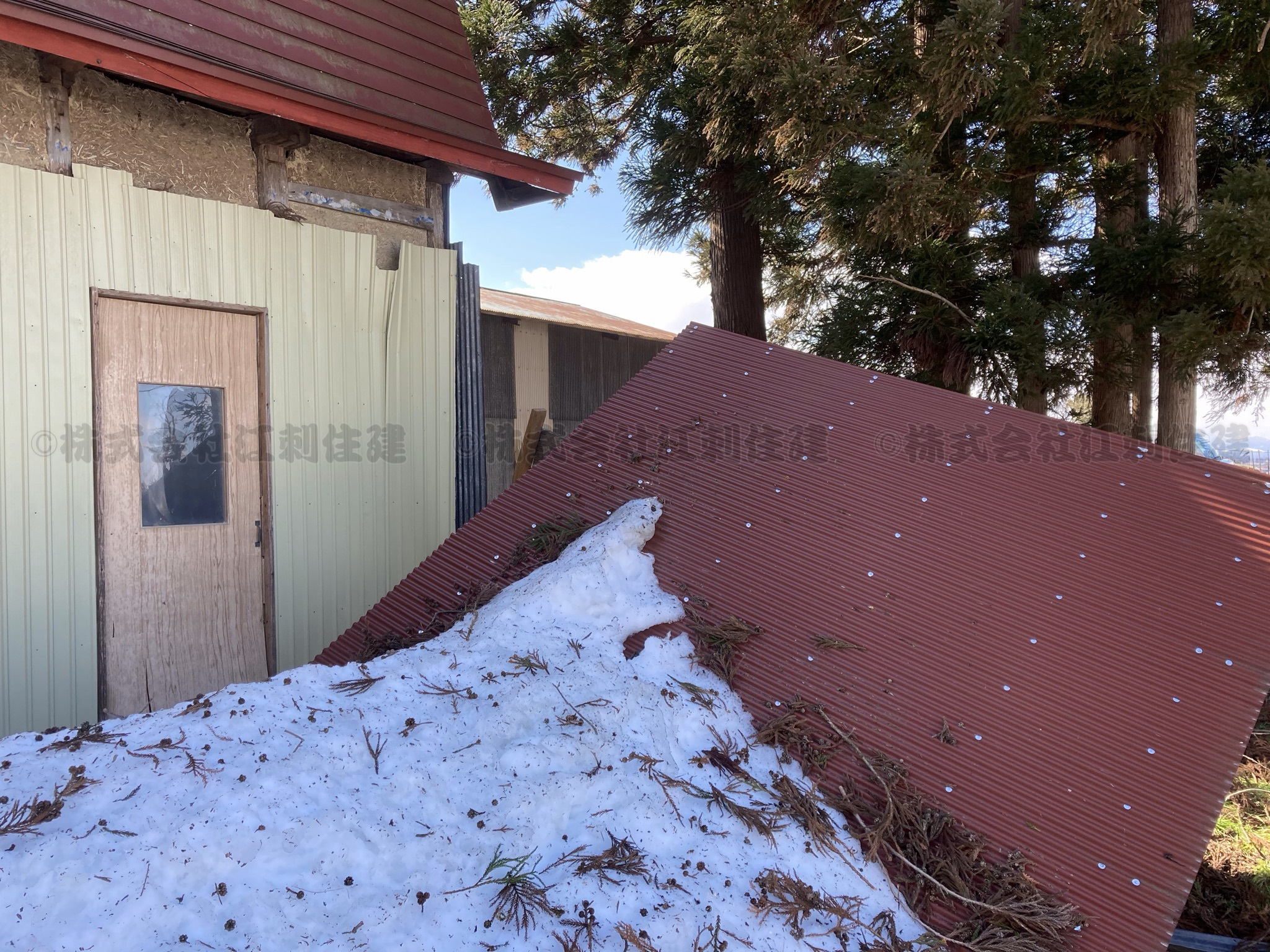 倉庫側の水下屋根勾配に対し、下屋の屋根勾配が弱かったため雪だまりとなり、溜まった雪の重さに耐えきれず、下屋の接続部分ごとつぶれてしまったようです。 せっかくなので、下屋だけではなく、外装材も復旧する事となり、外装材を貼るための下地から作り直しました。 既存出入口が片開き戸でしたが、ガタツキがありましたので、引違いのサッシを新設しました。 下屋復旧工事の状況です。 下屋の勾配を倉庫水下の屋根勾配に合わせ、雪が溜まっても流れやすい状態にしました。 小屋裏の状態です。