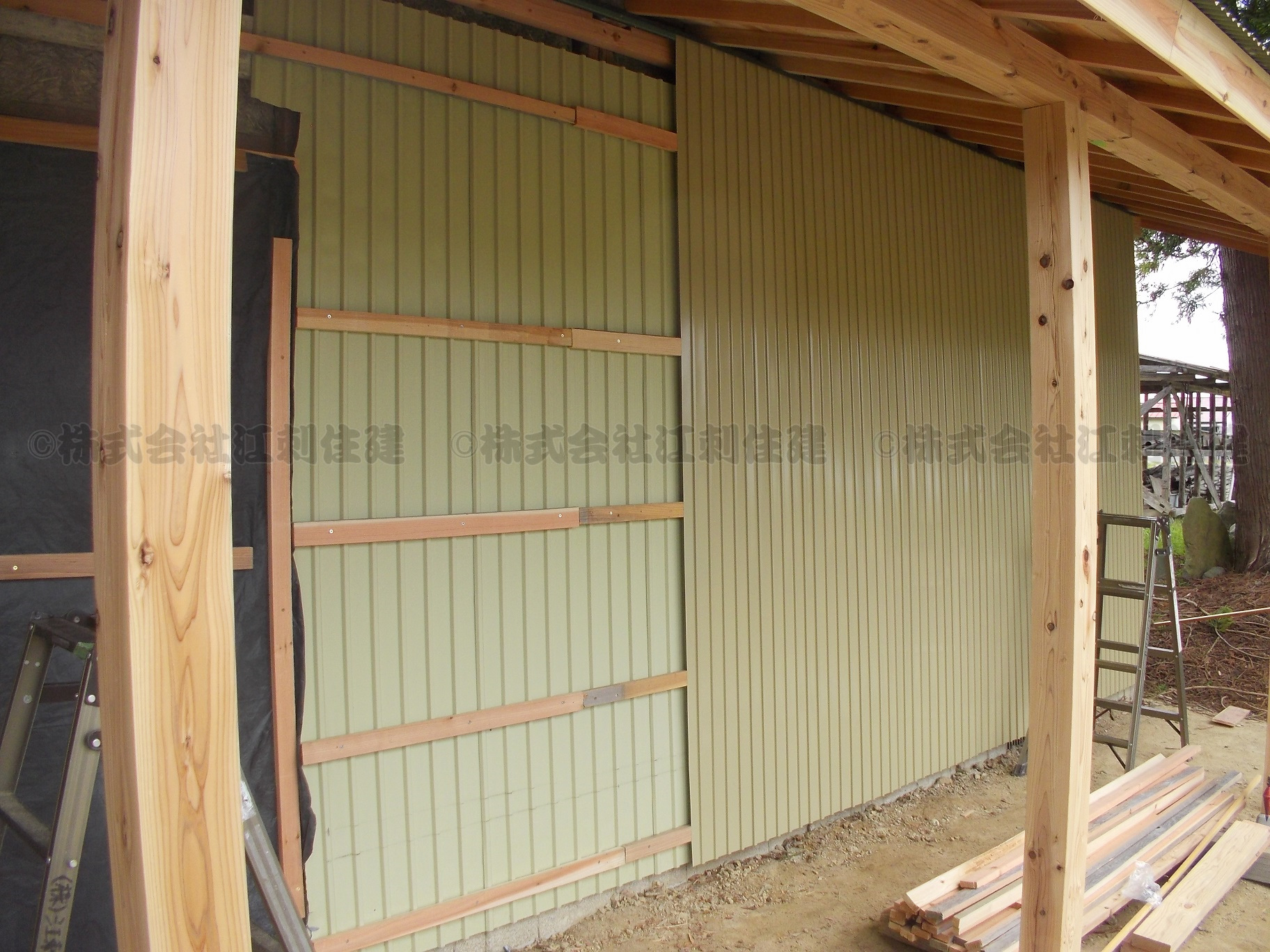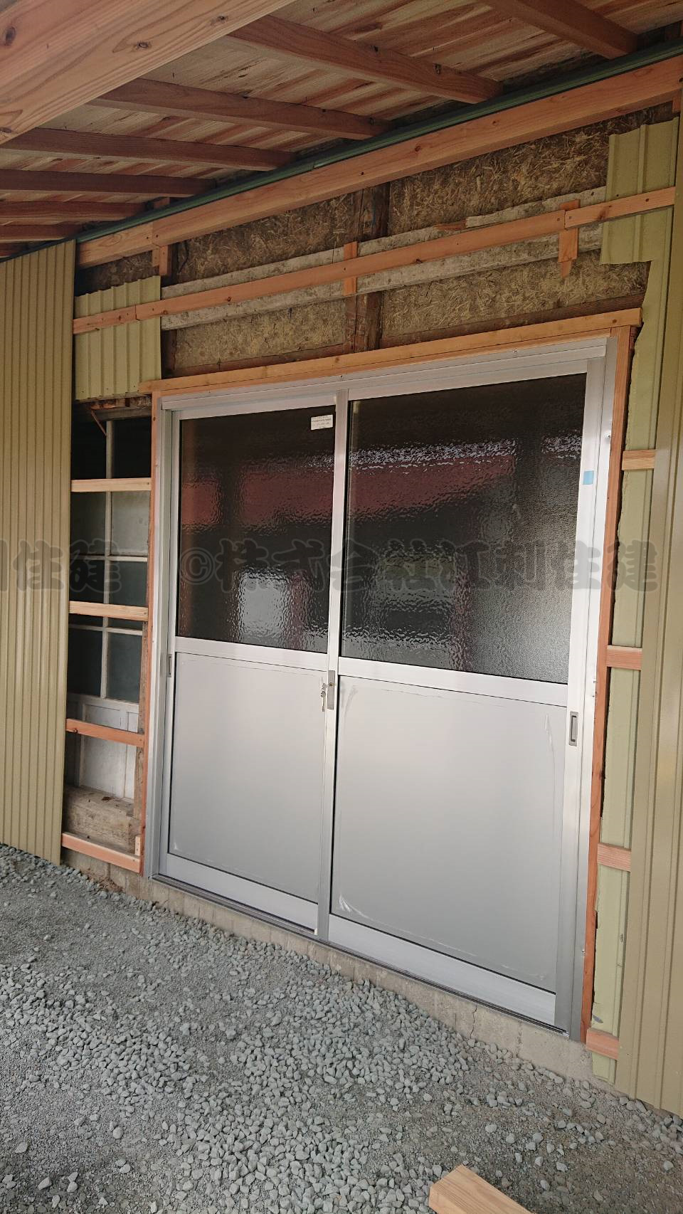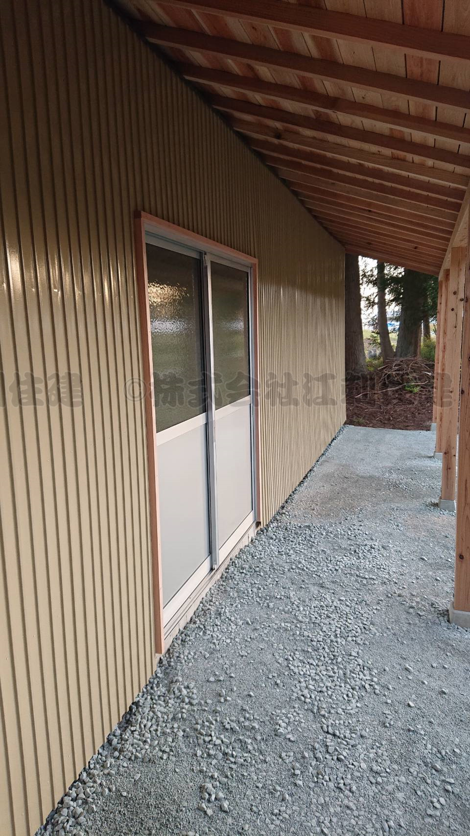 倉庫側の水下屋根勾配に対し、下屋の屋根勾配が弱かったため雪だまりとなり、溜まった雪の重さに耐えきれず、下屋の接続部分ごとつぶれてしまったようです。 せっかくなので、下屋だけではなく、外装材も復旧する事となり、外装材を貼るための下地から作り直しました。 既存出入口が片開き戸でしたが、ガタツキがありましたので、引違いのサッシを新設しました。 下屋復旧工事の状況です。 下屋の勾配を倉庫水下の屋根勾配に合わせ、雪が溜まっても流れやすい状態にしました。 小屋裏の状態です。