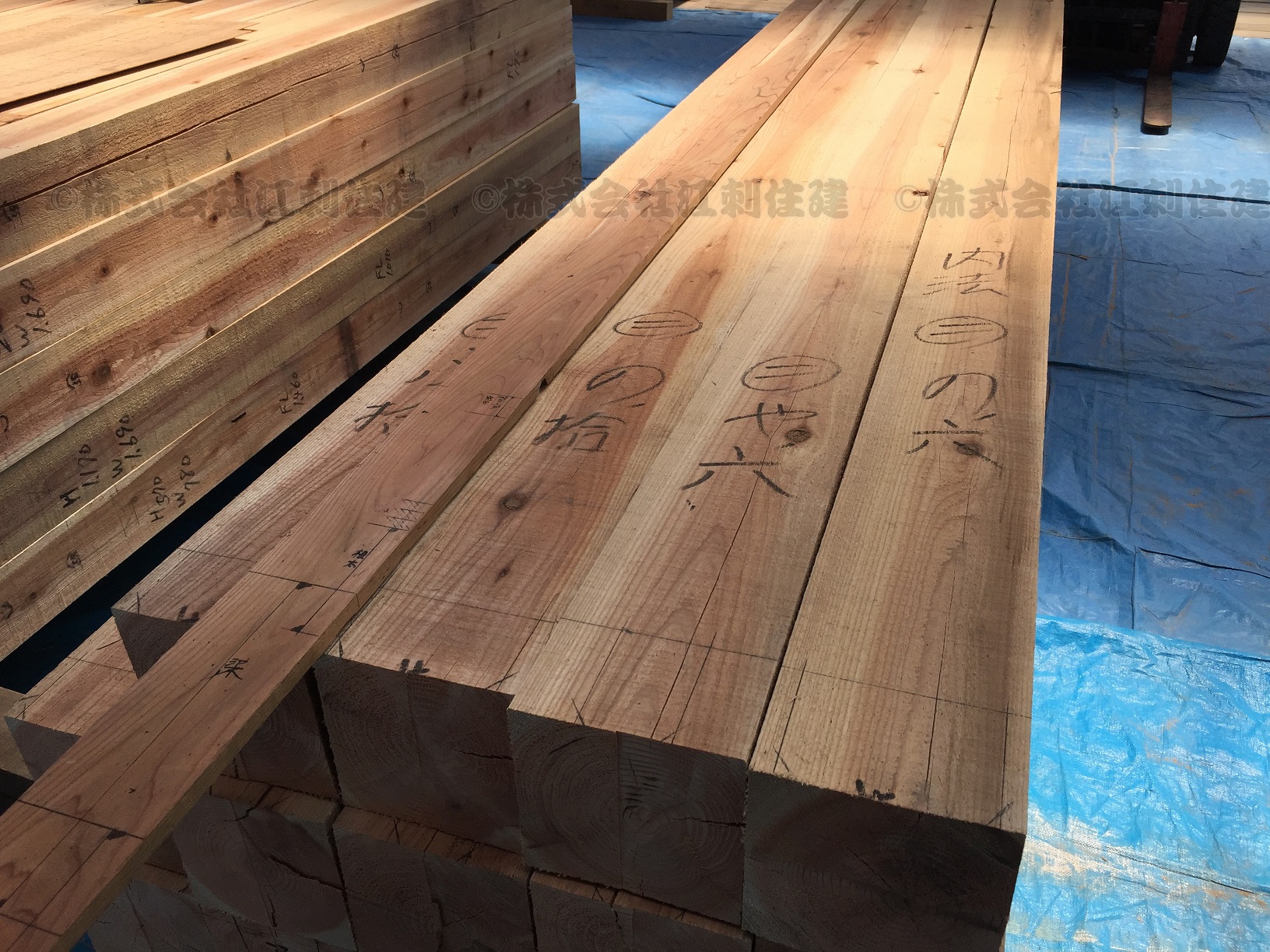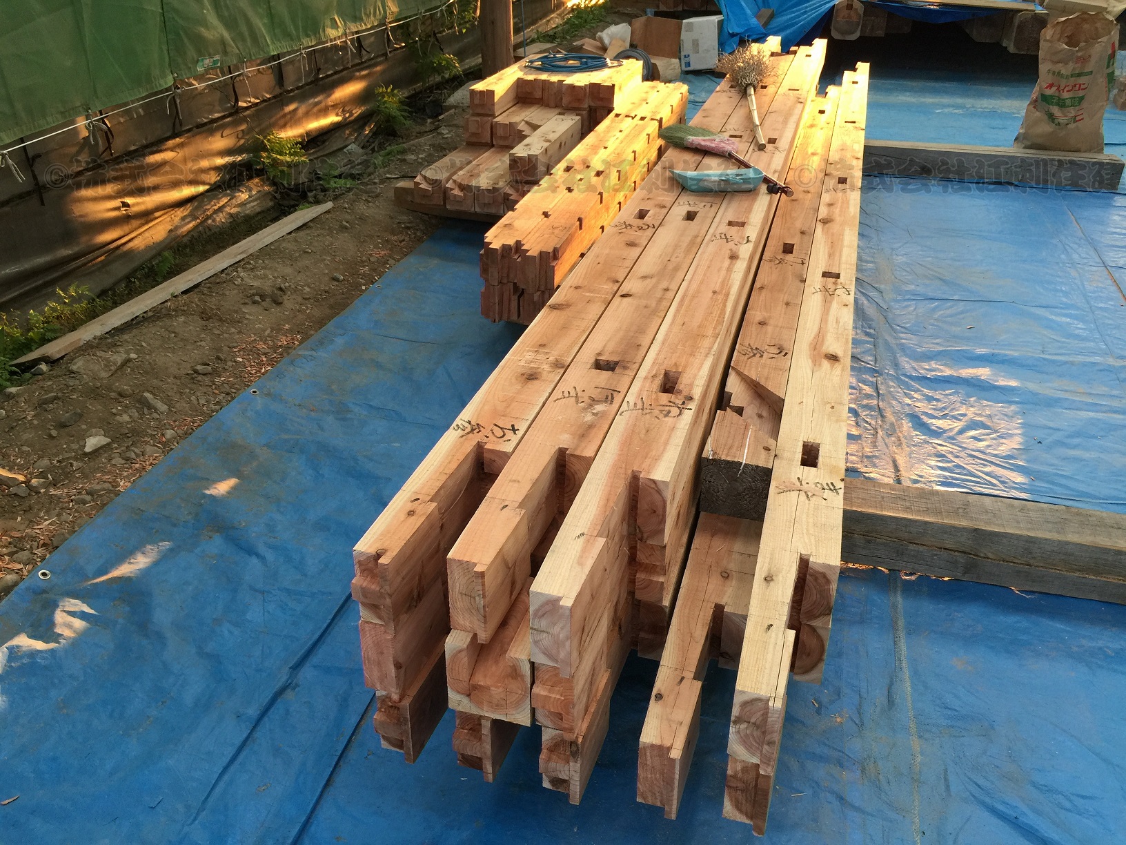 梁などの横臥材の加工状況です。ほぞ穴や金輪継ぎを加工したところです。 無垢材の利点は、木と木を繋げる際に、極力金物を使わなくても繋ぐことが出来ます。 昔から大工さんの技術でもある、伝統的軸組み工法の代表的な継手・仕口工法です。