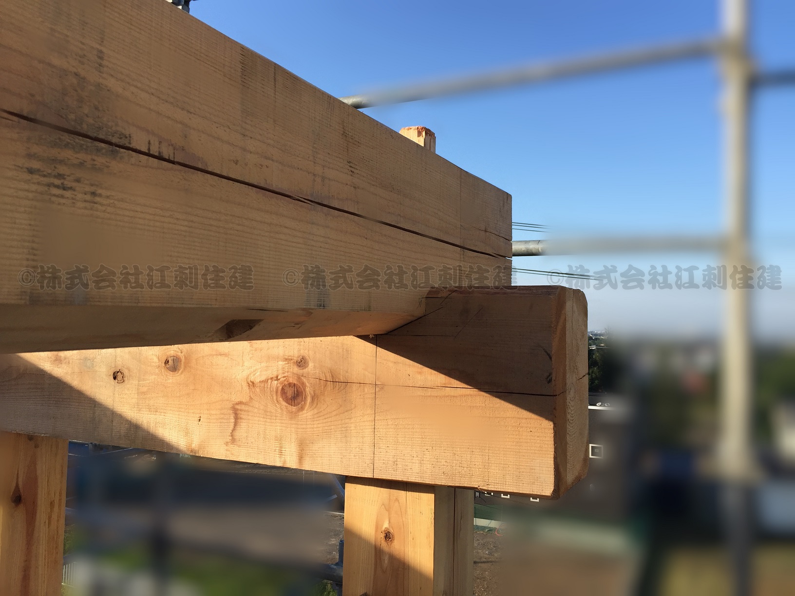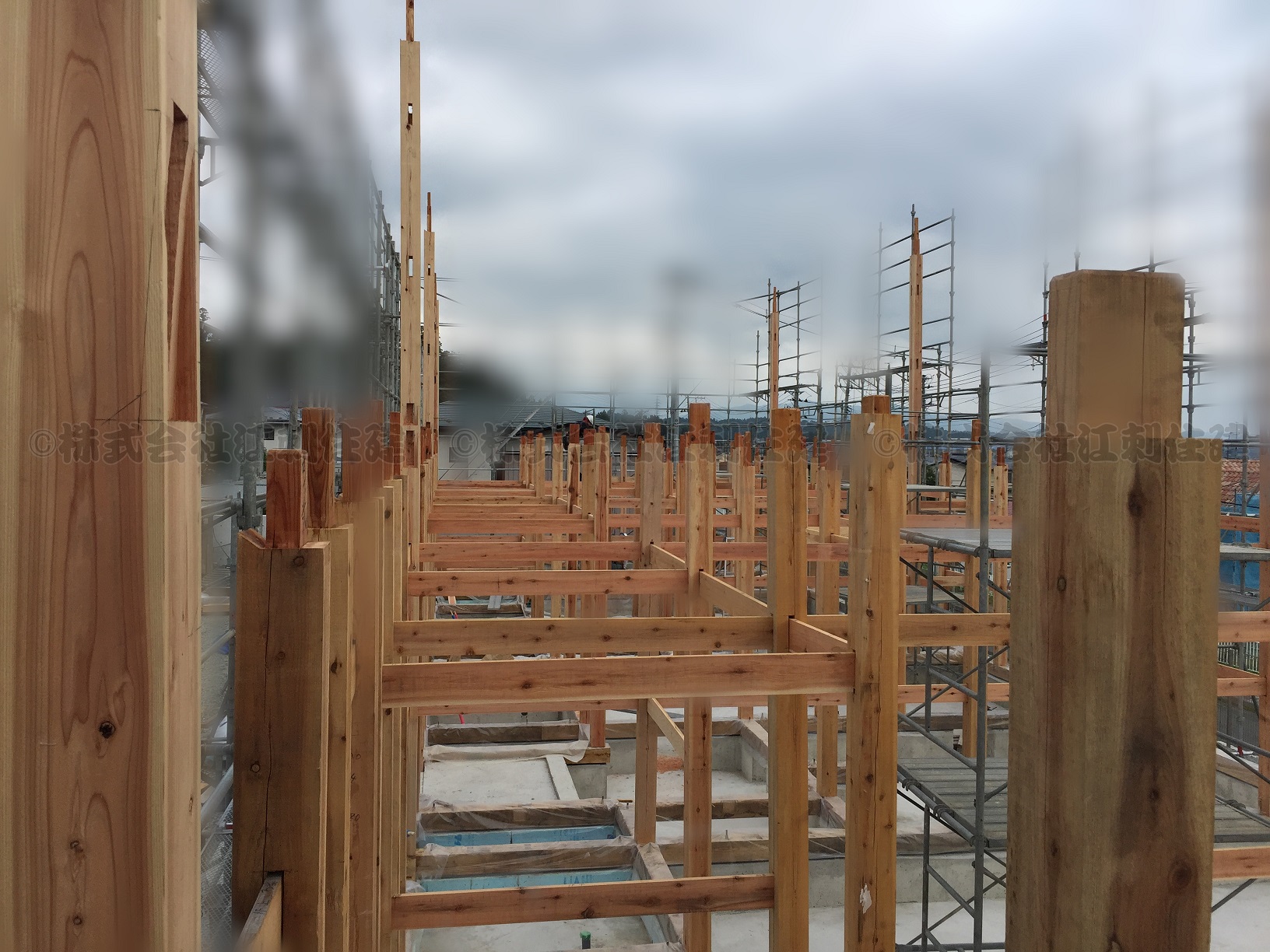 1Fの建方が終わり、梁等を入れる前の状況です。 写真奥の長い柱は通し柱と言い、先端部分をホゾと言います。桁と梁を繋ぐ重要な部分となります。構造材はほぼ仕上げ材に隠れてしまうので、この作業は木造づくりにおいてとても重要な内容になります。