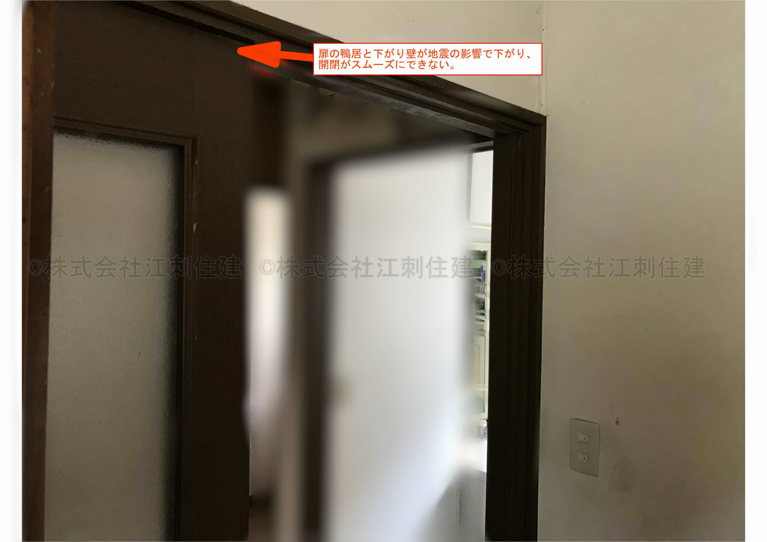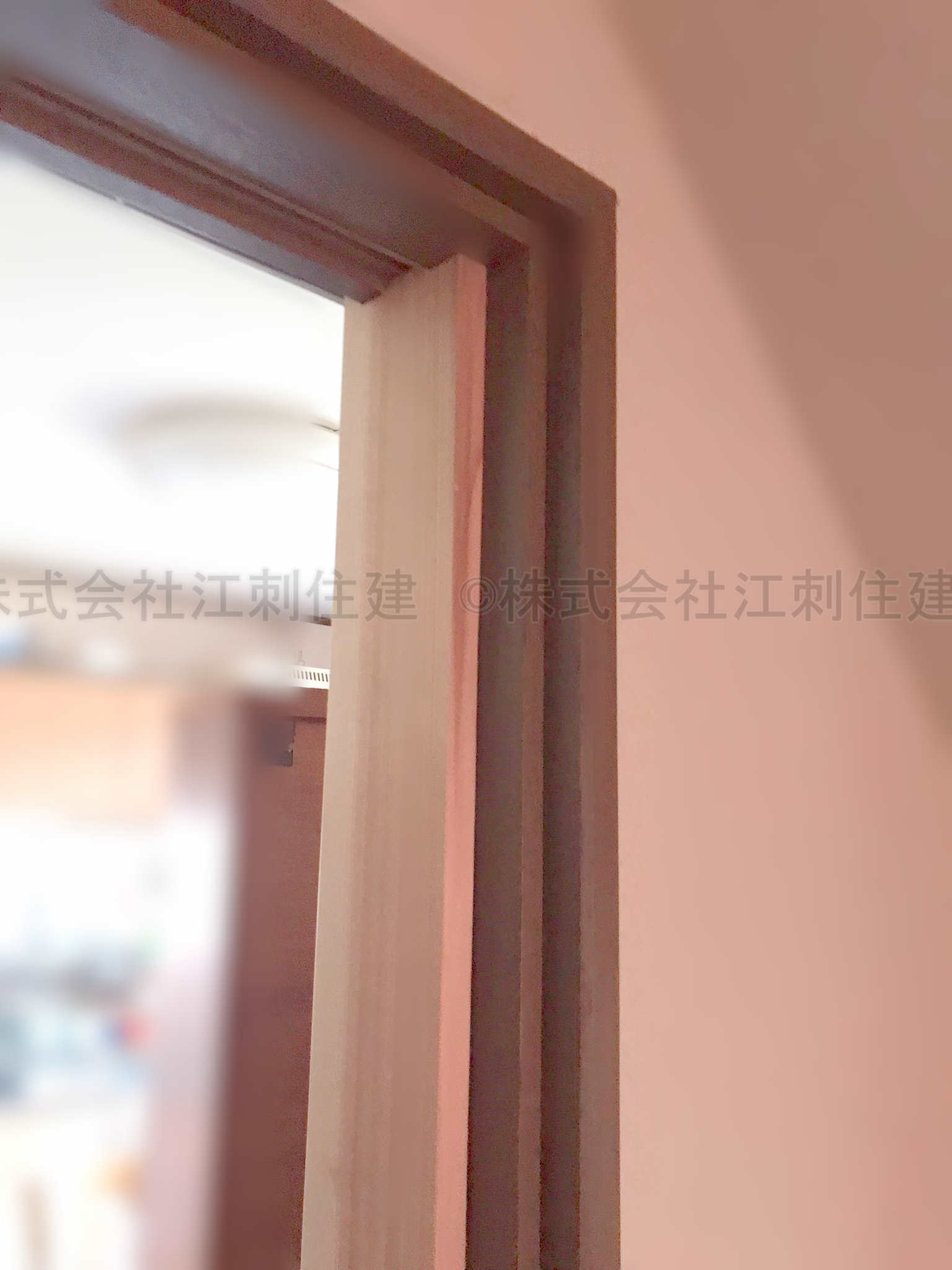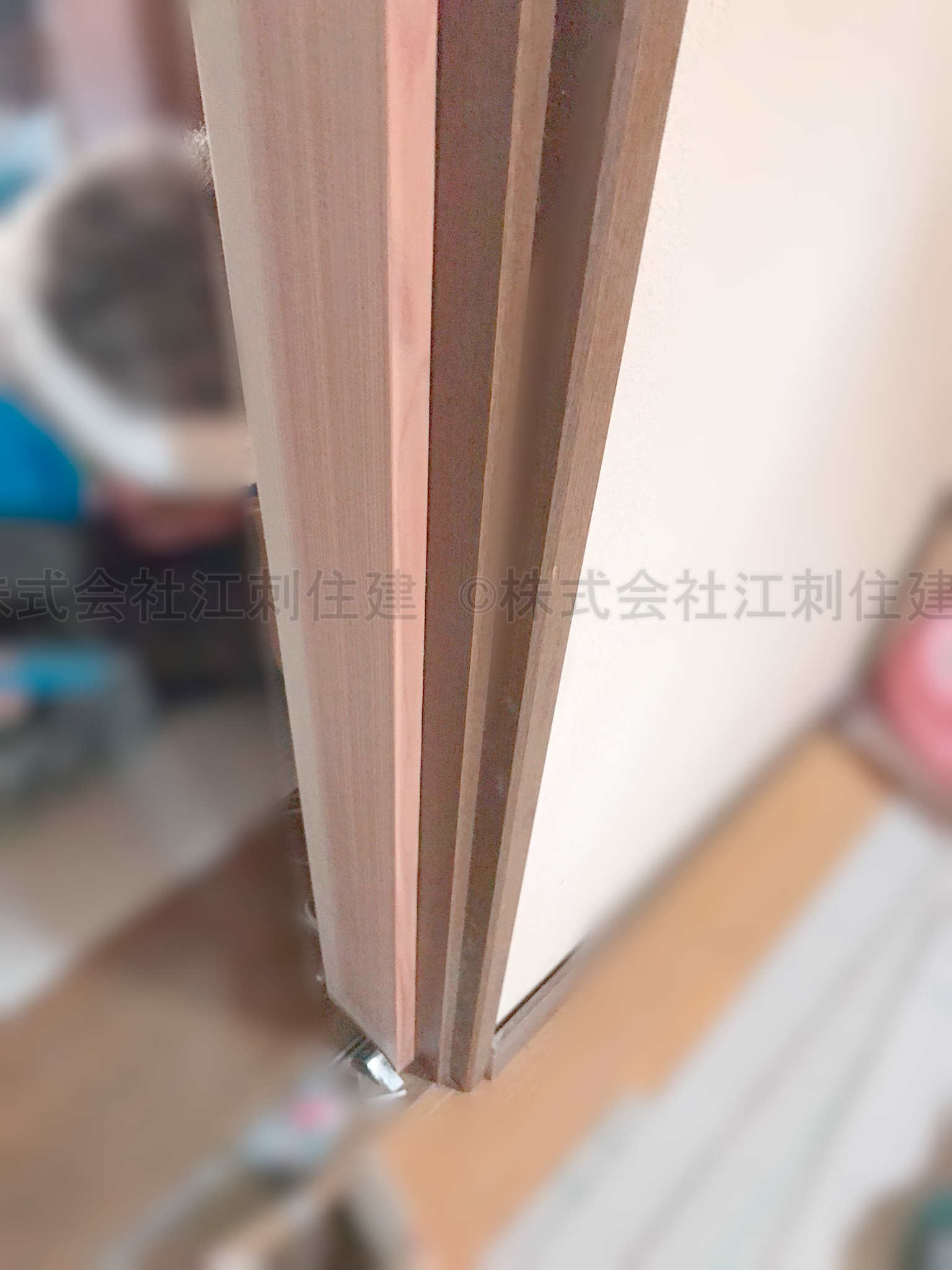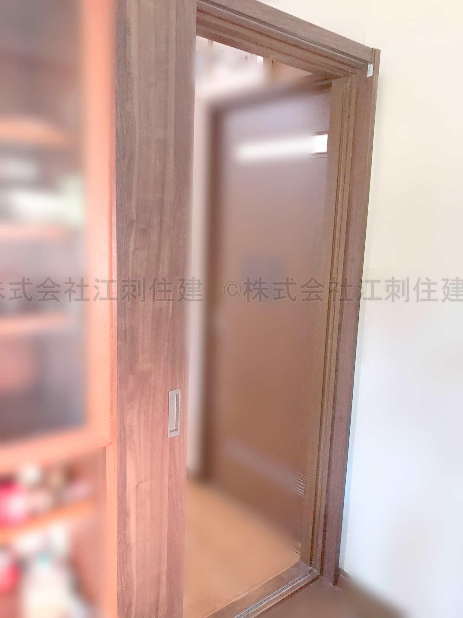 扉が外れにくく、扉の戸車調整も難しくなり、できれば扉の枠や壁を壊さずにリフォームできないかと要望があり、今回はアウトセット引戸を取付ける事にしました。 本来はドア扉の枠を利用して下がり壁に取り付けるのですが、今回は引戸。どうしても既存の引き代に隙間が出来るので、下がり壁と床を支える方立てを隙間の分の大きさで新規で取付けしました。 アウトセット引戸は主にリフォームで使用される吊戸なので、扉調整も扉の上側のみ。戸車タイプよりも扉が軽いため、こういった扉工事では要望が一番多い商品です。 引戸の扉が開いた状態。今回の形状が縦框が着くタイプだったので、ギリギリ照明スイッチにぶつからずに施工出来ました。 引戸の扉が閉まった状態。遜色なく開け閉め出来ました。扉と壁のすき間の方立のおかげで下がり壁の補強と隙間風の対策がとれる形ができました。