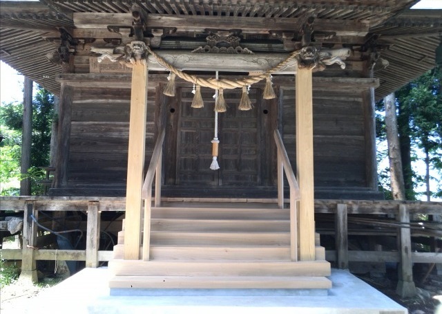 集落で受け継がれている神社の、階段、手すり等の改修工事を行いました。