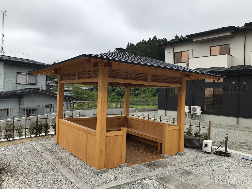 Y企業様の長屋敷地内に、東屋を作ってほしいとご依頼いただき、新設工事をさせていただきました。